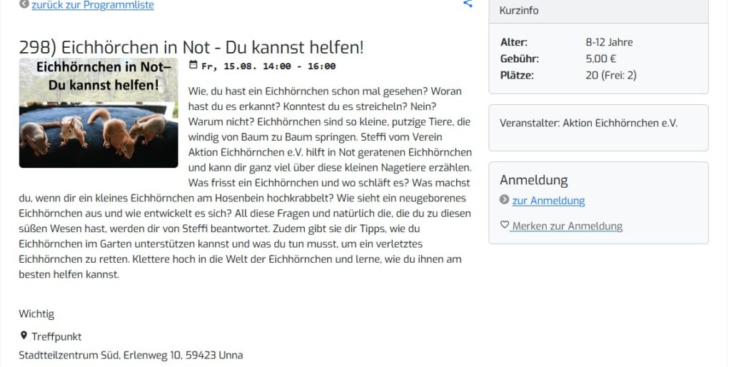 - Am 12./13.09.2025 stehen wir mit einem Infostand vor dem Futterhaus in Holzwickede (Wilhelmstraße 4). Dort gibt es dann auch unsere erste Auflage Kalender 2026 und natürlich viele Infos um die Eichhörnchen. Schon jetzt, Danke an Claudi, die unterstützen wird!