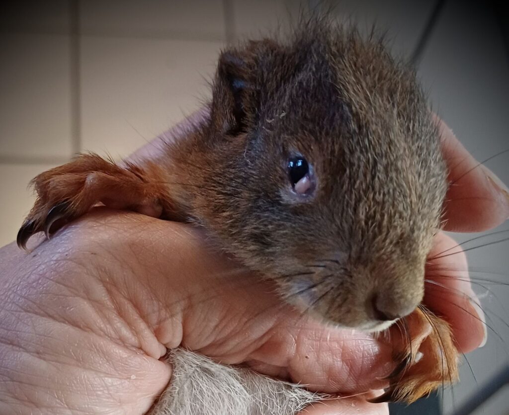 NN ist ein 5 Tage altes Eichhörnchen (!), hat noch keinen Namen; heute morgen ist der Rest der Nabelschnur abgefallen. Definitiv sind alle unsere Überwinterungsplätze weg, Susanne und Heiko werden gut zu tun haben.