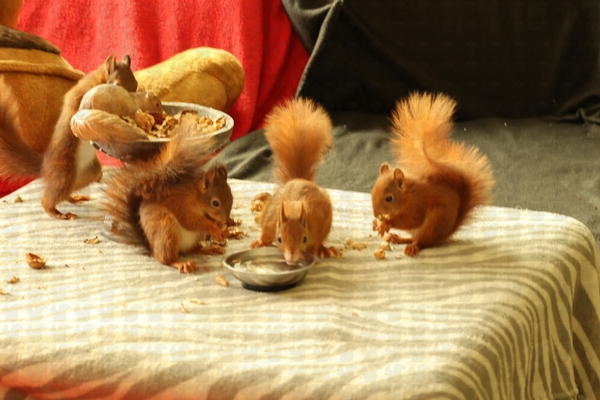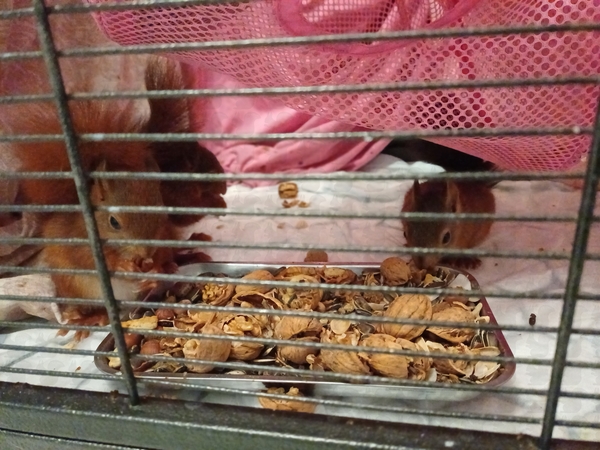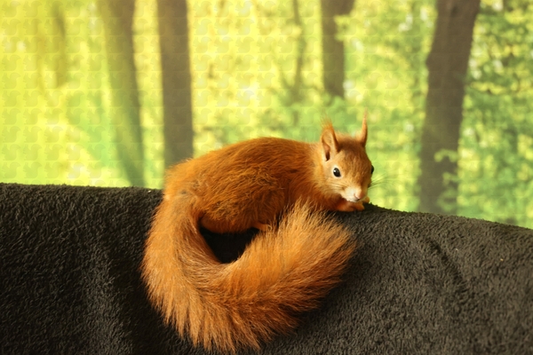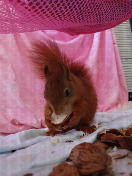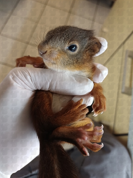 adulte Eichkatze, blutige Nase, abgestürzt, seit 3 Tagen frisst sie wieder selbständig. Wir haben sie durch unsere TA untersuchen lassen, es wurde nichts gefunden, auch keine Endoparasiten im Kot. Sie frisst und trinkt, leider läuft und klettert sie noch nicht. Sie wird mit homöopathischen Mitteln abgedeckt, wir geben ihr noch ein bisschen Zeit. Wenn sie wieder fit wird, darf sie direkt in die Grundschule wieder zurück: