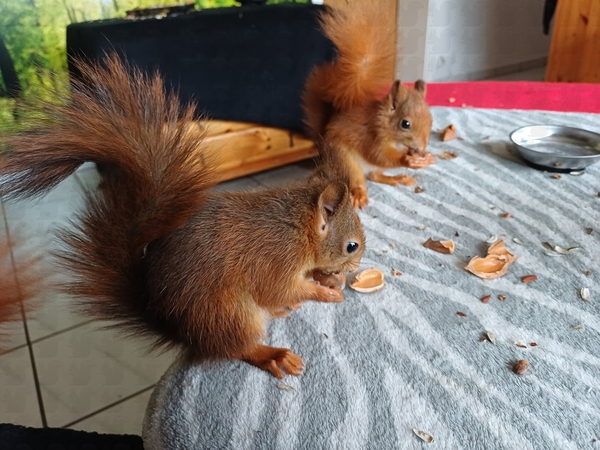 Am Dienstag mussten wir schweren Herzens Marie gehen lassen. Ihre Zahnfehlstellung wurde immer schlimmer, keine Aussicht auf Erfolg. Da sie sehr „wild“ geworden ist und wir kaum noch an sie rankamen, mussten wir diesen schweren Schritt gehen. Mach‘ es gut kleine Marie, du hattest leider einen ganz schlechten Fehlstart ins Leben, konntest aber ein paar Wochen mit deinen Artgenossen im Wohnzimmer spielen. Grüß‘ alle Hörnchen im Himmel …