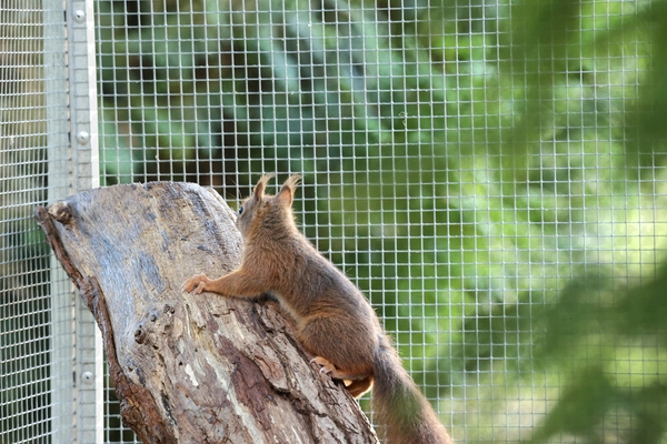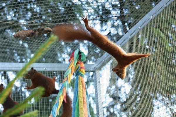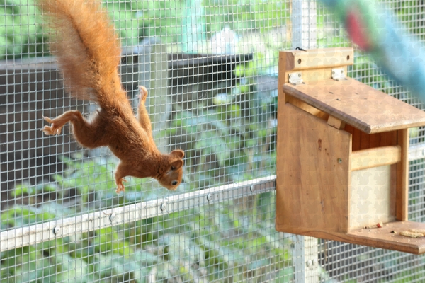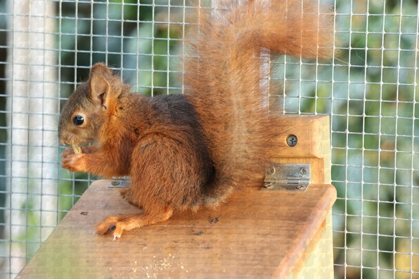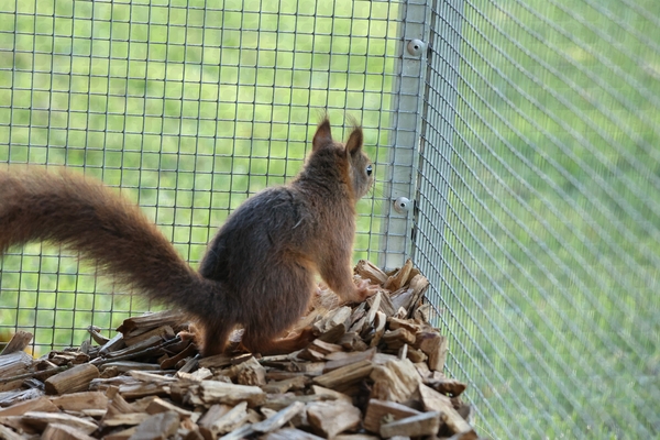 Die Klappe ist schon auf, jetzt wird es Zeit, dass sie nach draußen kommen. Die nächsten Tage versprechen gut zu werden, Nüsse sind reichlich vorhanden, Pilze und Hagebutten auch. Sie müssen sich eine Unterkunft suchen oder bauen, soweit sie das überhaupt können, ansonsten werden die vor ihnen Ausgewilderten den ein oder anderen Kobel schon verlassen haben, der dann ausgebessert und genutzt werden kann. Die Klappe bleibt etwas länger offen, wahrscheinlich bis zum 03.10. und dann – sollte kein Rückkehrer mehr da sein -, geschlossen, so dass nach Gehegereinigung unsere Überwinterer einziehen können.