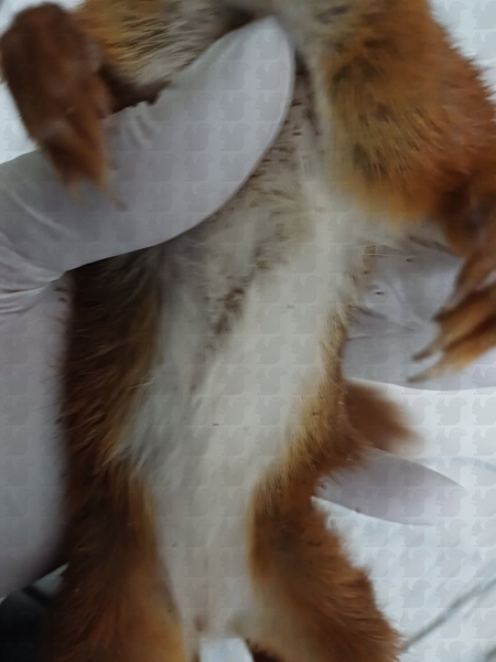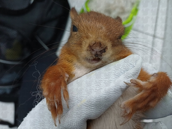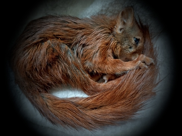 Er hat sehr gerne seine Elektrolyte getrunken, alle 2 Stunden, laufen konnte er vor Schwäche kaum, blieb einfach an Ort und Stelle liegen, so dass wir nicht erkennen konnten, ob noch etwas an den Gliedmaßen gebrochen war. Montag war eigentlich alles gut, Stronghold tat seine Wirklung, Haarlinge noch vorhanden aber alle mausetot, der Kleine tapste schon ein bisschen in seiner Transportbox herum, aber nur wenig, er sollte sich ja auch schonen. Bis heute zur Mittagspause schien alles auf einem guten Weg. Bei der Mittagsfütterung war er über die Regenbogenbrücke gegangen. Wir waren irgendwie fassungslos, weil wir dachten nach 48 Stunden hätten wir ihn vielleicht „gedreht“. Leider nicht, er hat sich still und heimlich auf den Weg über die Regenbogenbrücke gemacht. Wir haben alles versucht und er war ein ganz lieber Eichkater, der eigentlich an Menschen überhaupt nicht gewöhnt war. Schade, wir hätten gerne mit einer Erfolgsgeschichte die Saison beendet. Leb wohl kleiner Eichkater, wir hätten dir so gerne geholfen!