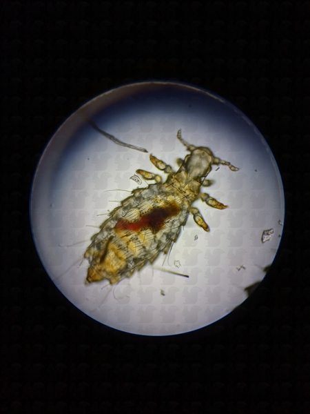 Schon beim „Einpacken“ war klar, das ist kein Rückkehrer von unseren Ausgewilderten, sondern das muss eine „Nachwuchskraft“ von unseren Ausgewilderten sein (deshalb „unechter Rückkehrer“), er war noch viel zu klein, rundlicher Kopf, ca. 12 Wochen. Aber er wusste wohl, dass es in dem Garten Nahrung gibt und auch offensichtlich Hilfe. Dann den „Kleinen“, ein Bube, ausgepackt. Puh, Nase war mal blutig, aber schon verkrustet, d.h. Absturz, Schneidezähne unten abgebrochen, alles noch kein Problem, aber: massiver Haarlingsbefall und kalkweiße Pfotenballen (Hinweis auf Blutarmut). Die Haarlinge sehen unter dem Mikroskop so aus und saugen Blut:
